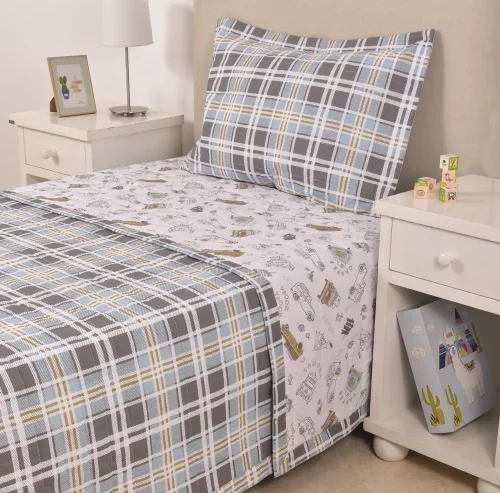 Edredón Kids Cuadros Celeste Gris Y Mostaza
