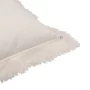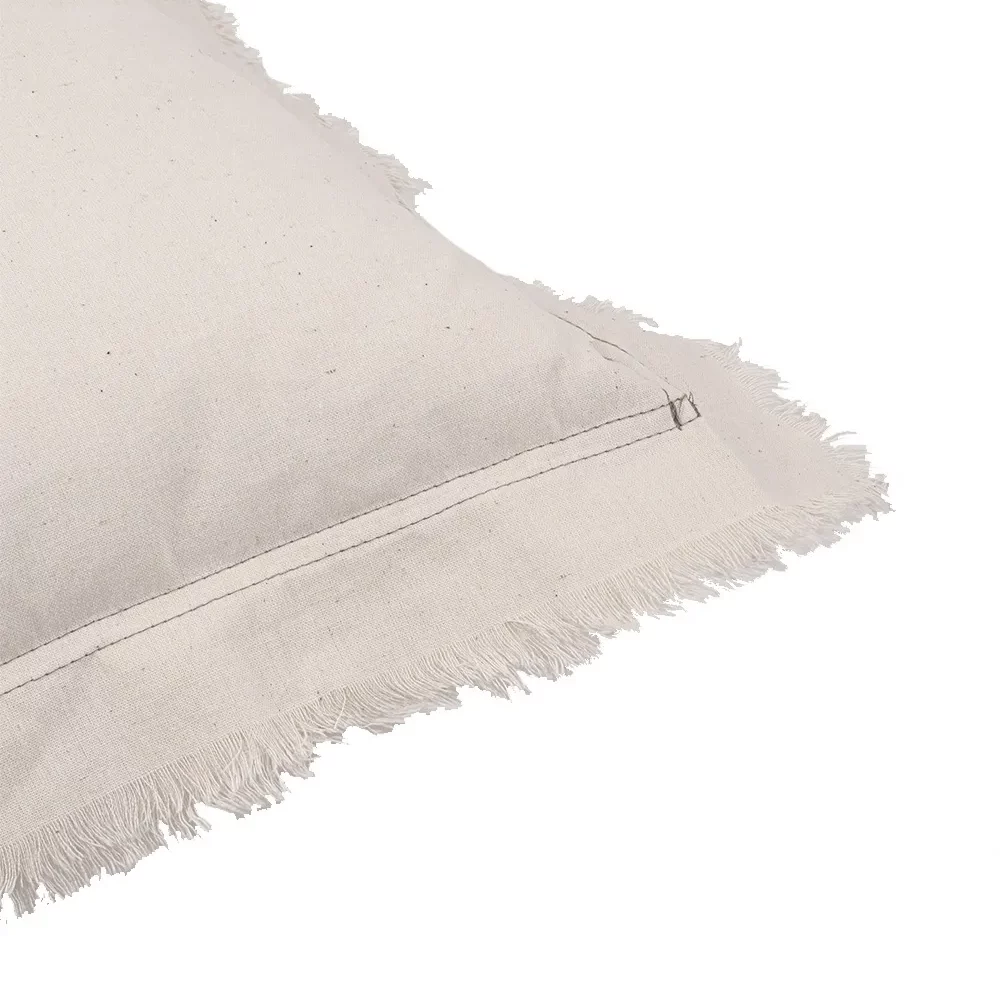 Almohadón decorativo con tejido de algodón en tono crudo, detalle de costura en color verde y flecos en el contorno, ofreciendo un look rústico y natural.