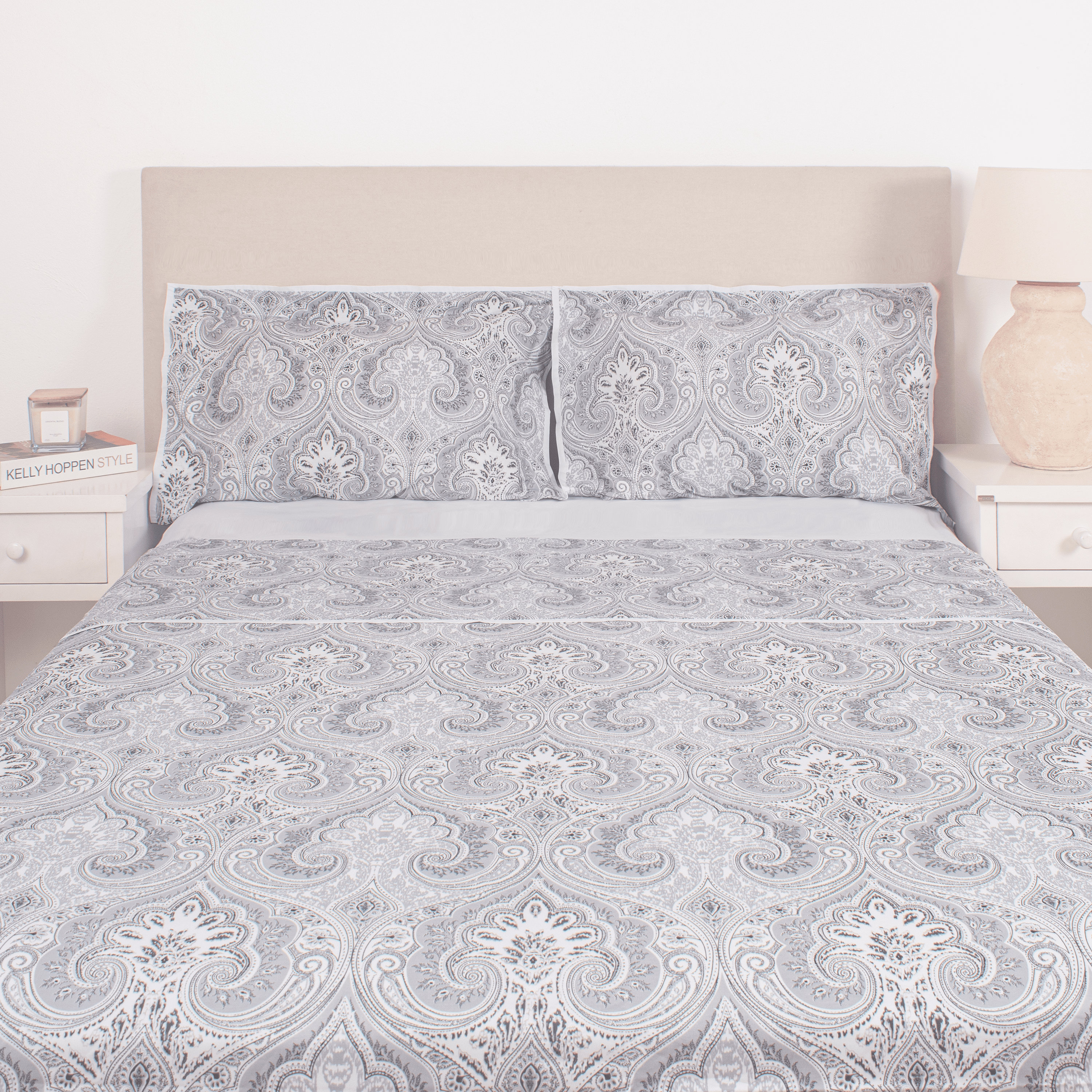 Juego de sábanas tejido sabanero 200 hilos. Contiene una sábana ajustable de 30cm de vértice, una sábana superior (el tamaño Twin y Twin Plus contiene una sola funda). Puede complementarse con el Edredón y el cubrecama del mismo diseño