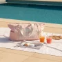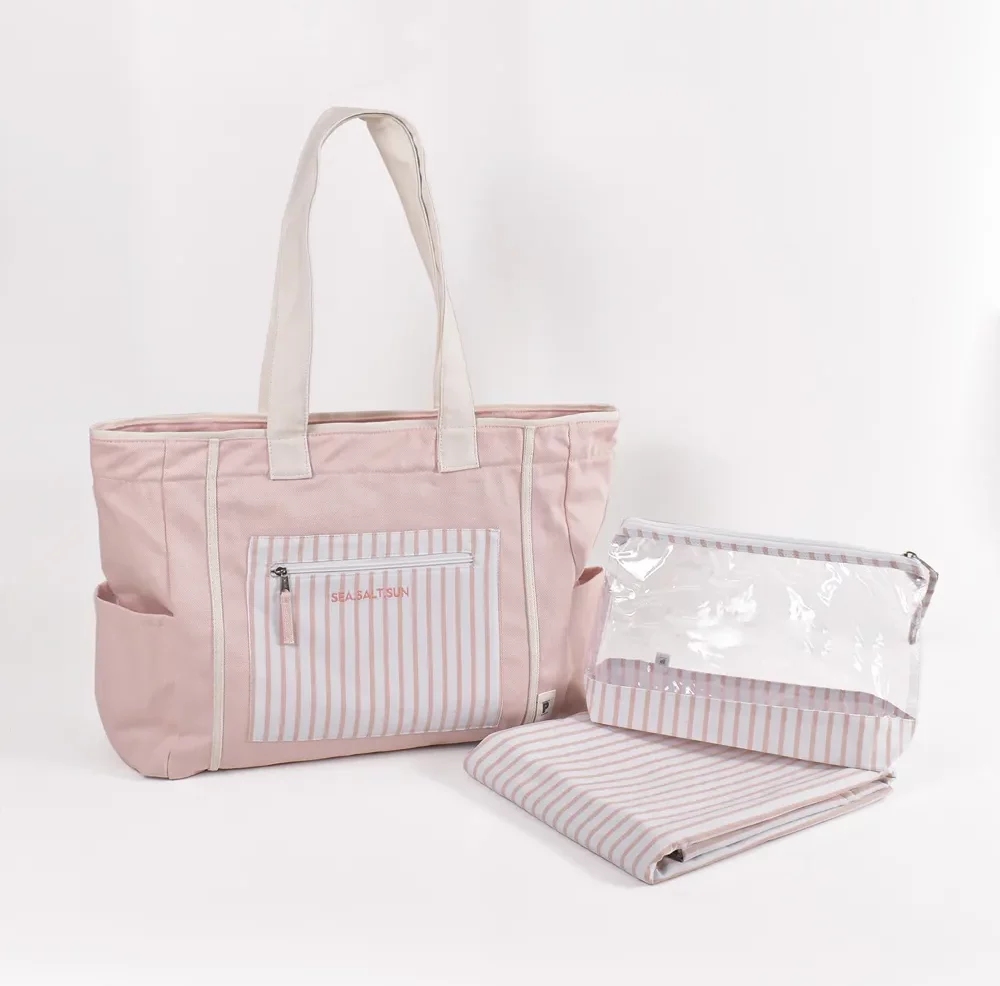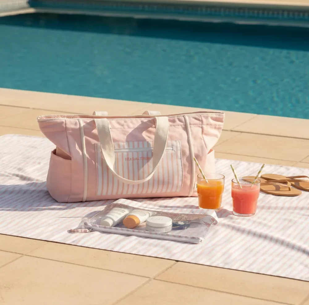 Kit veraniego con diseño a rayas rosas. Incluye una cartuchera y una manta, perfecto para llevar todo ordenado con un toque femenino.