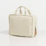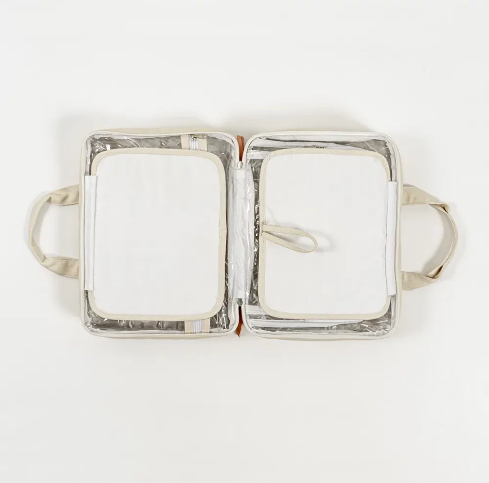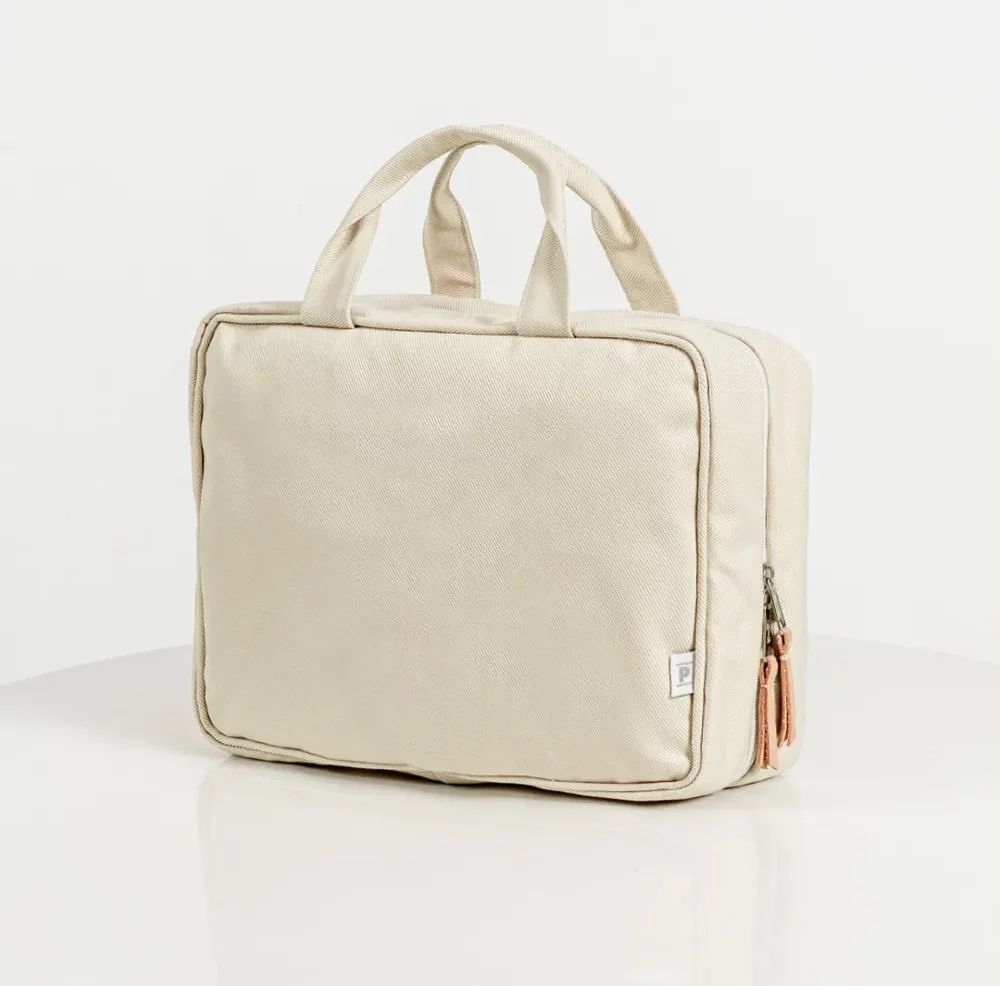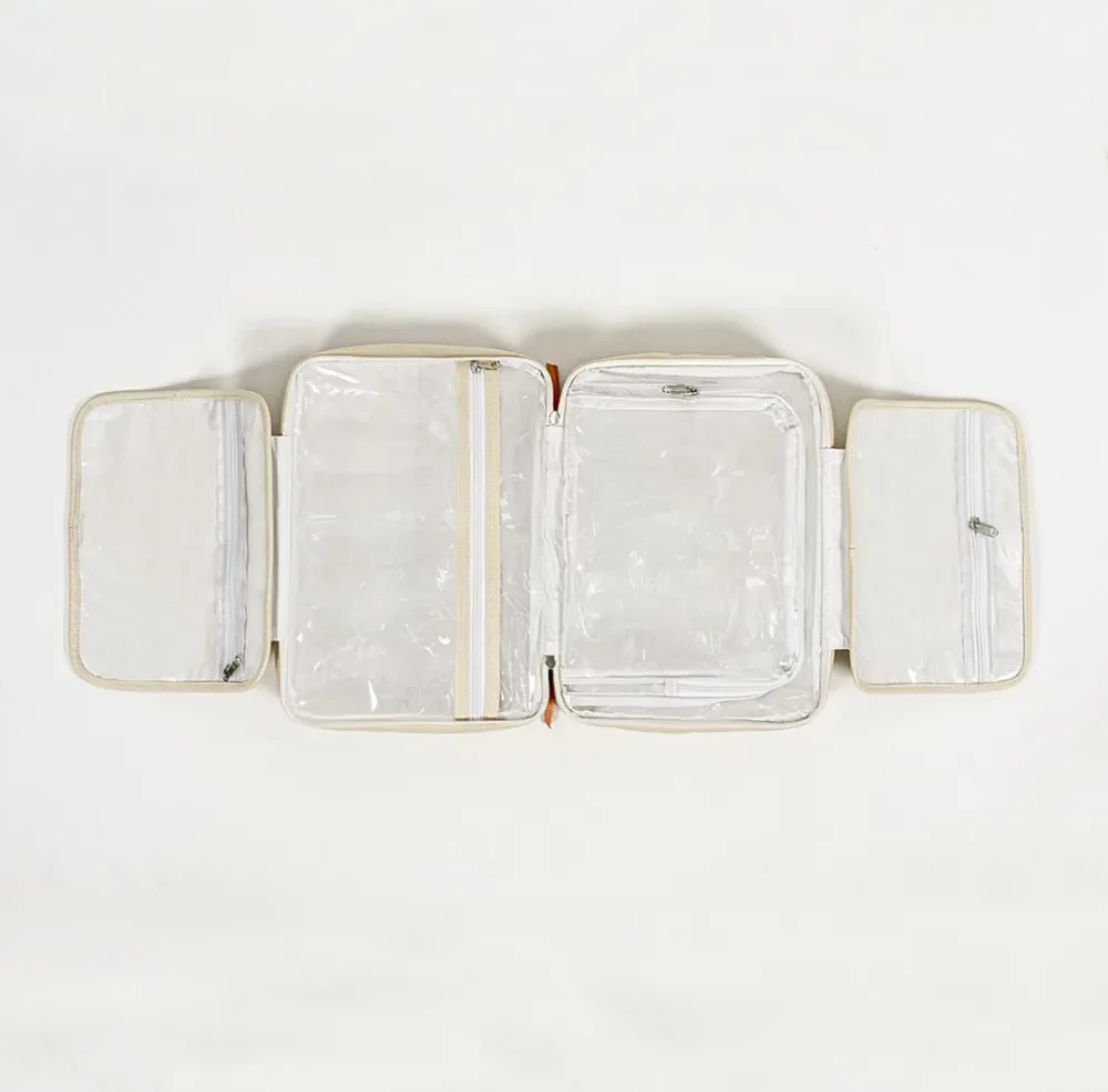 El Necessaire Eva es desplegable y ofrece cuatro amplios compartimientos internos para organizar artículos personales. Posee una tira que permite colgar el necessaire en la habitación o en el baño.