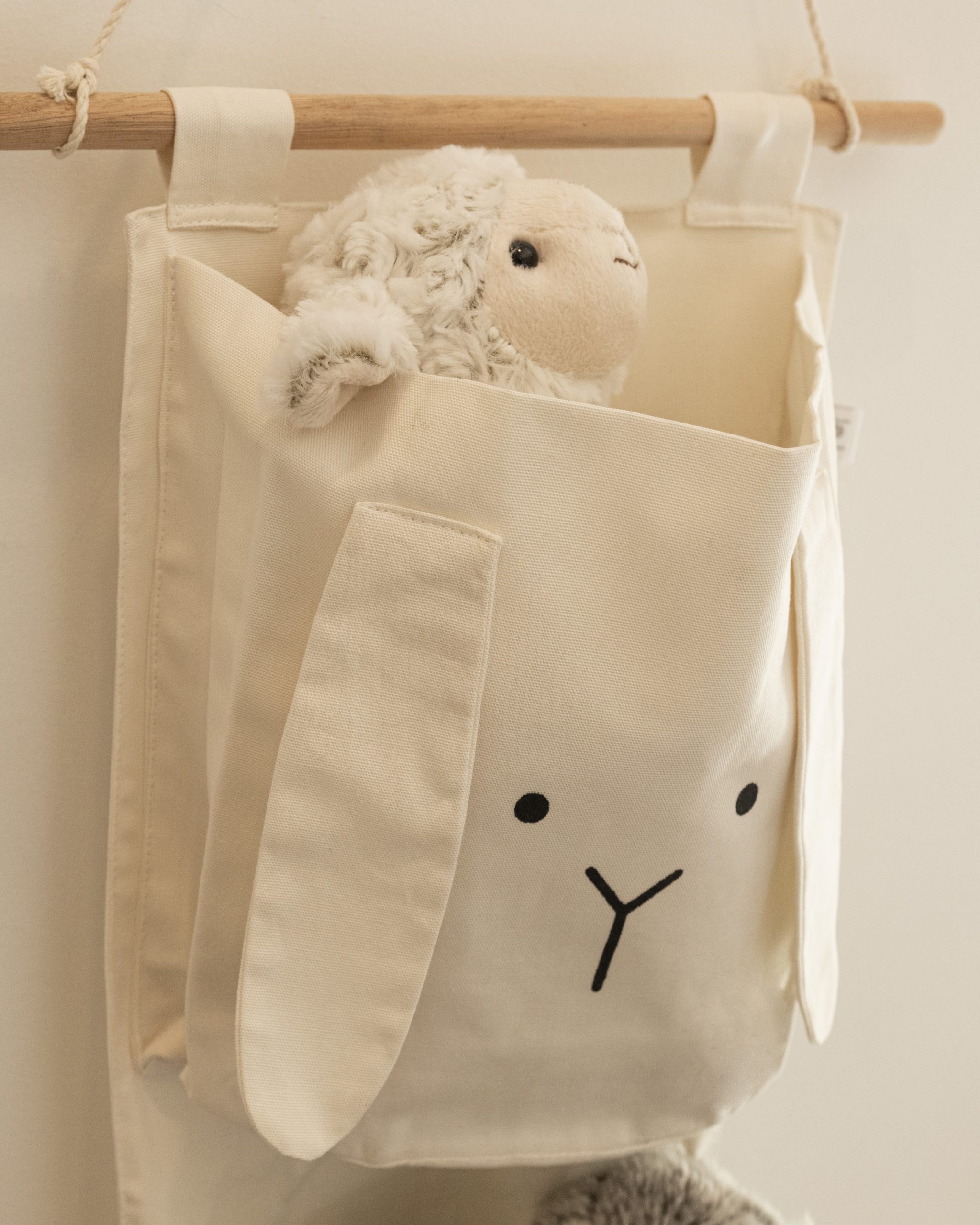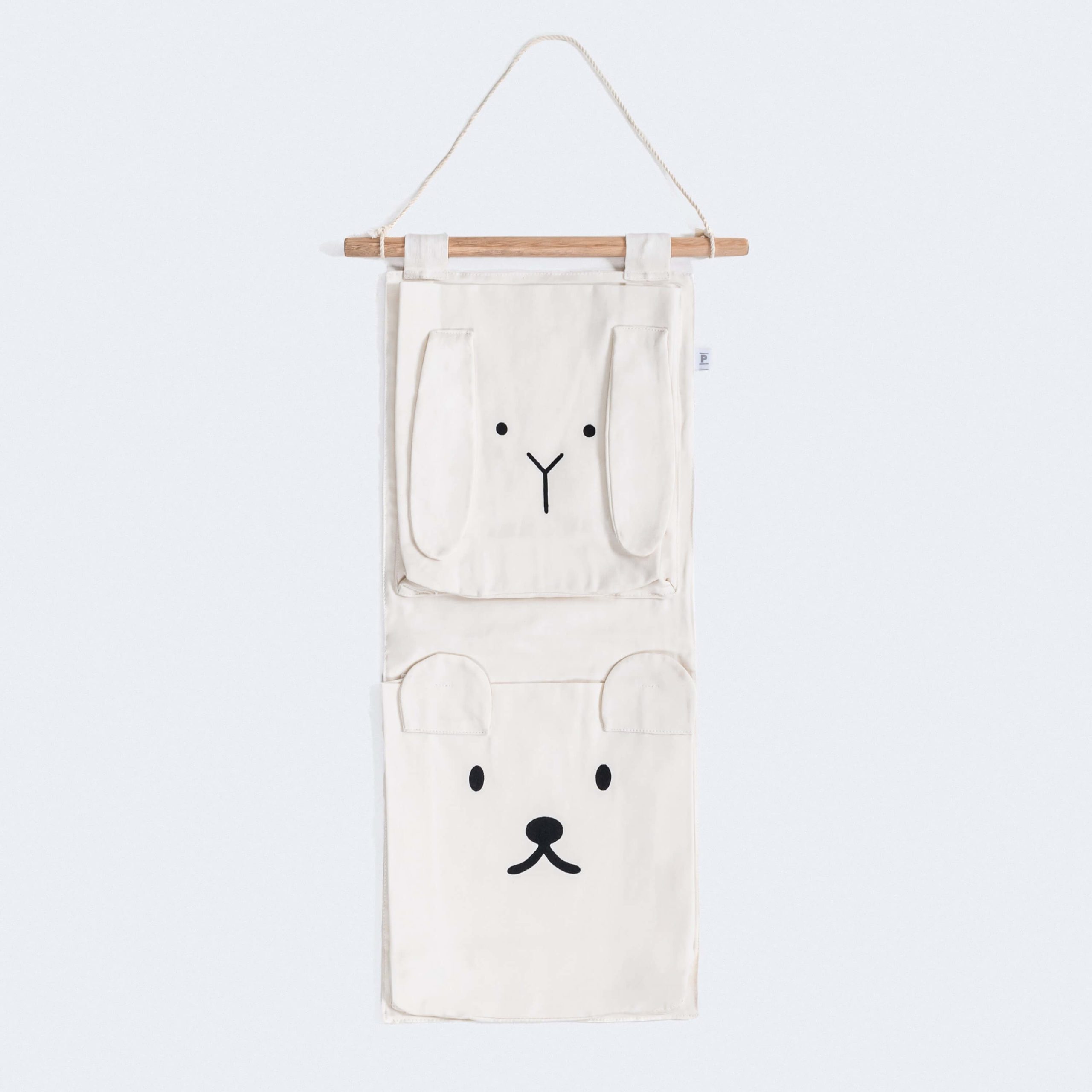 Este accesorio sirve para organizar juguetes y pertenencias de los niños. Posee dos amplios bolsillos con serigrafía infantil, una barra de madera y un hilo que sirve para colgar, ya sea por la pared o por la puerta de la habitación.