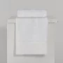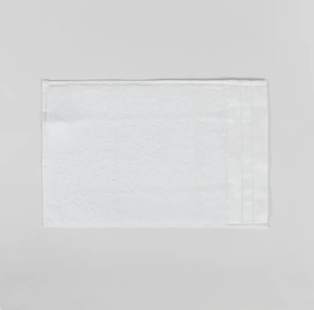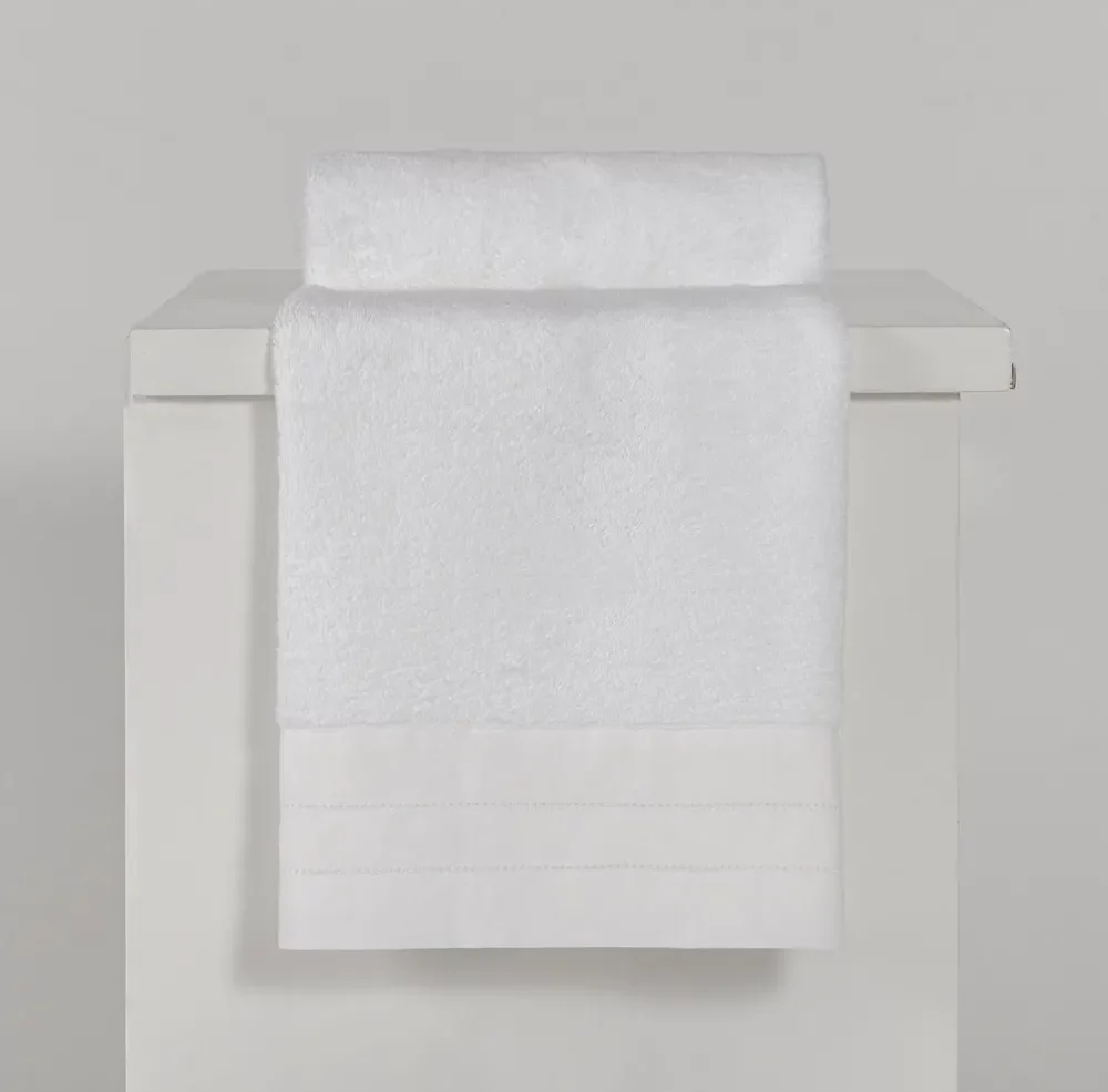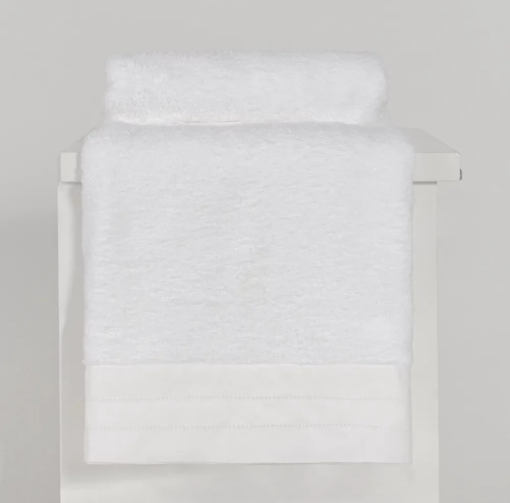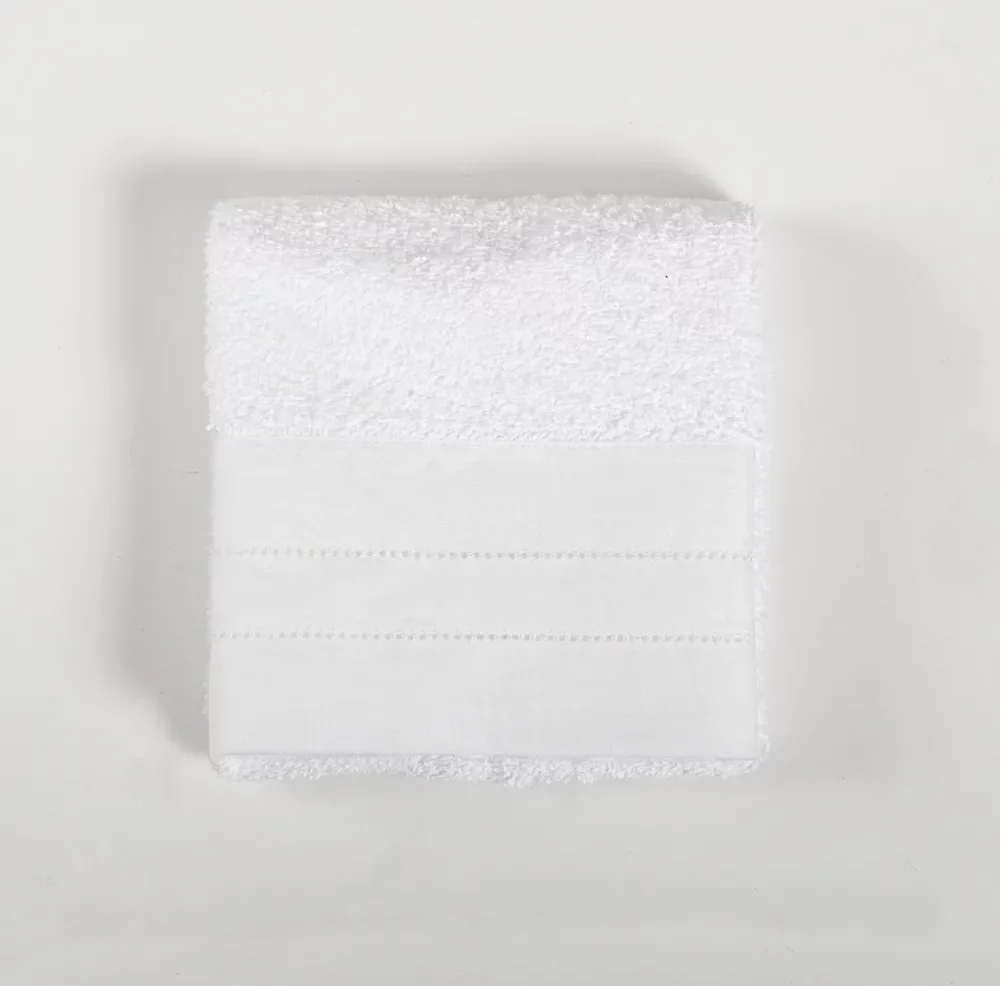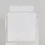 Toalla con aplicación de lino, un detalle que enmarca la toalla con su delicado punto ajour. La sencillez del diseño resalta la nobleza del tejido. Su tacto es ultrasuave gracias al algodón egipcio.