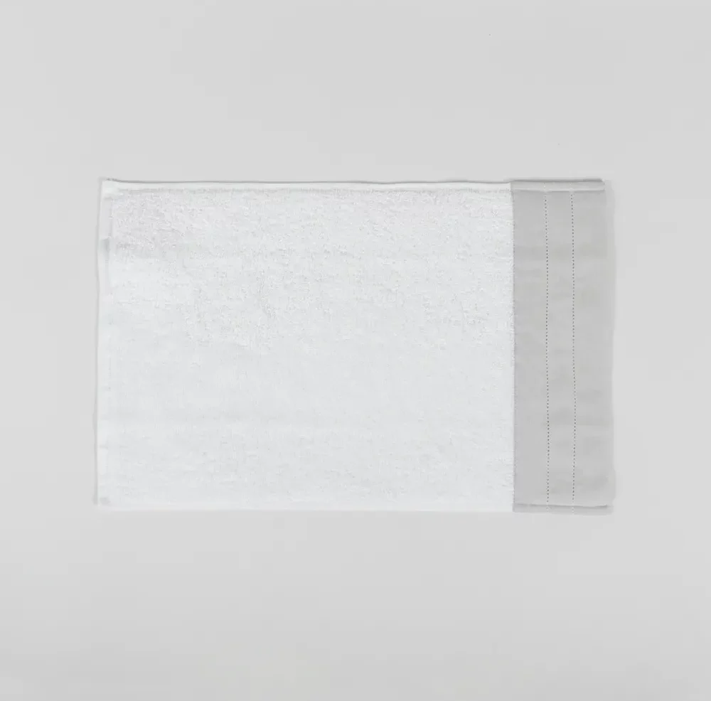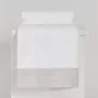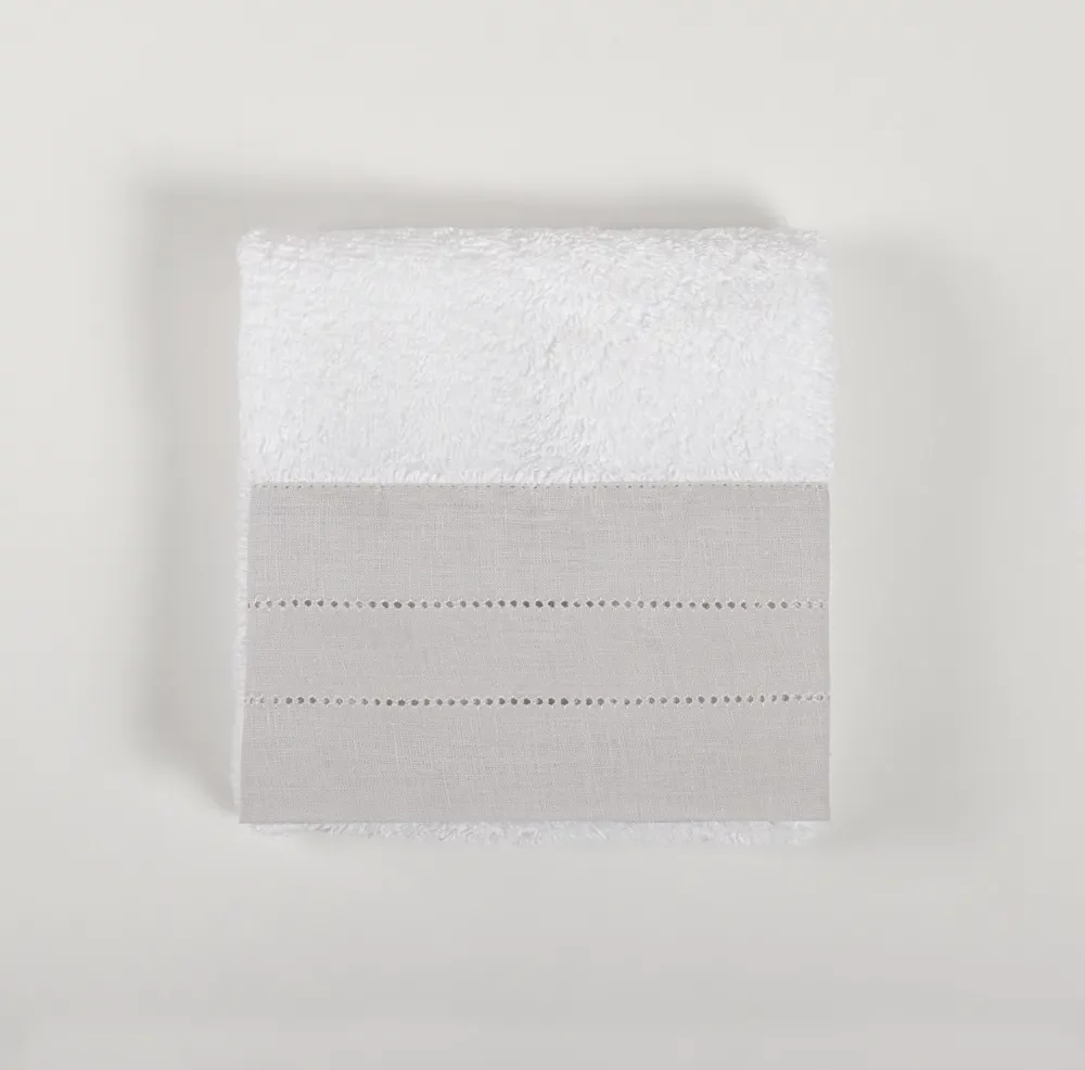 Toalla con aplicación de lino, un detalle que enmarca la toalla con su delicado punto ajour. La sencillez del diseño resalta la nobleza del tejido. Su tacto es ultrasuave gracias al algodón egipcio.