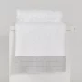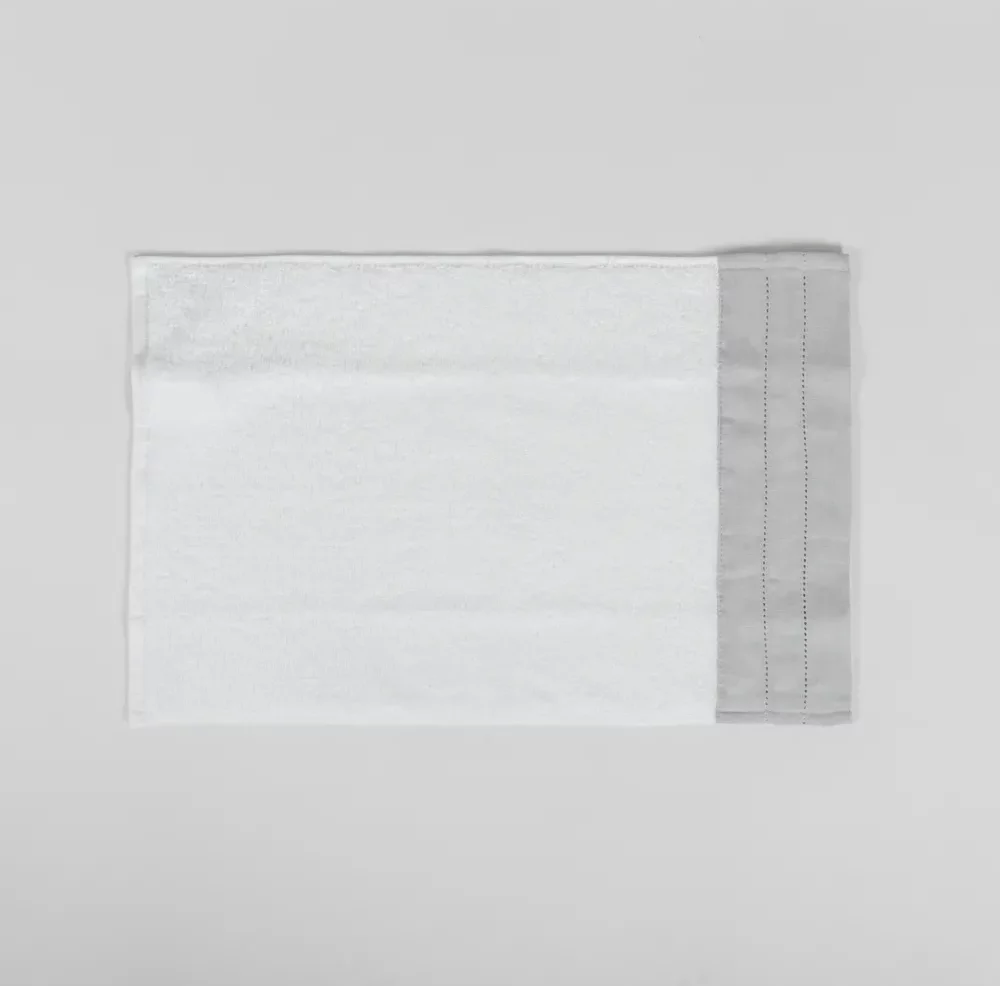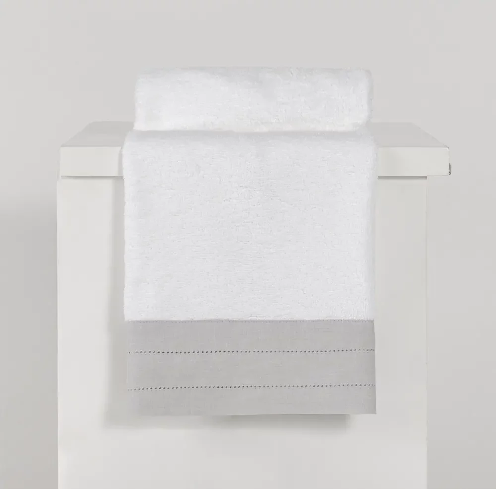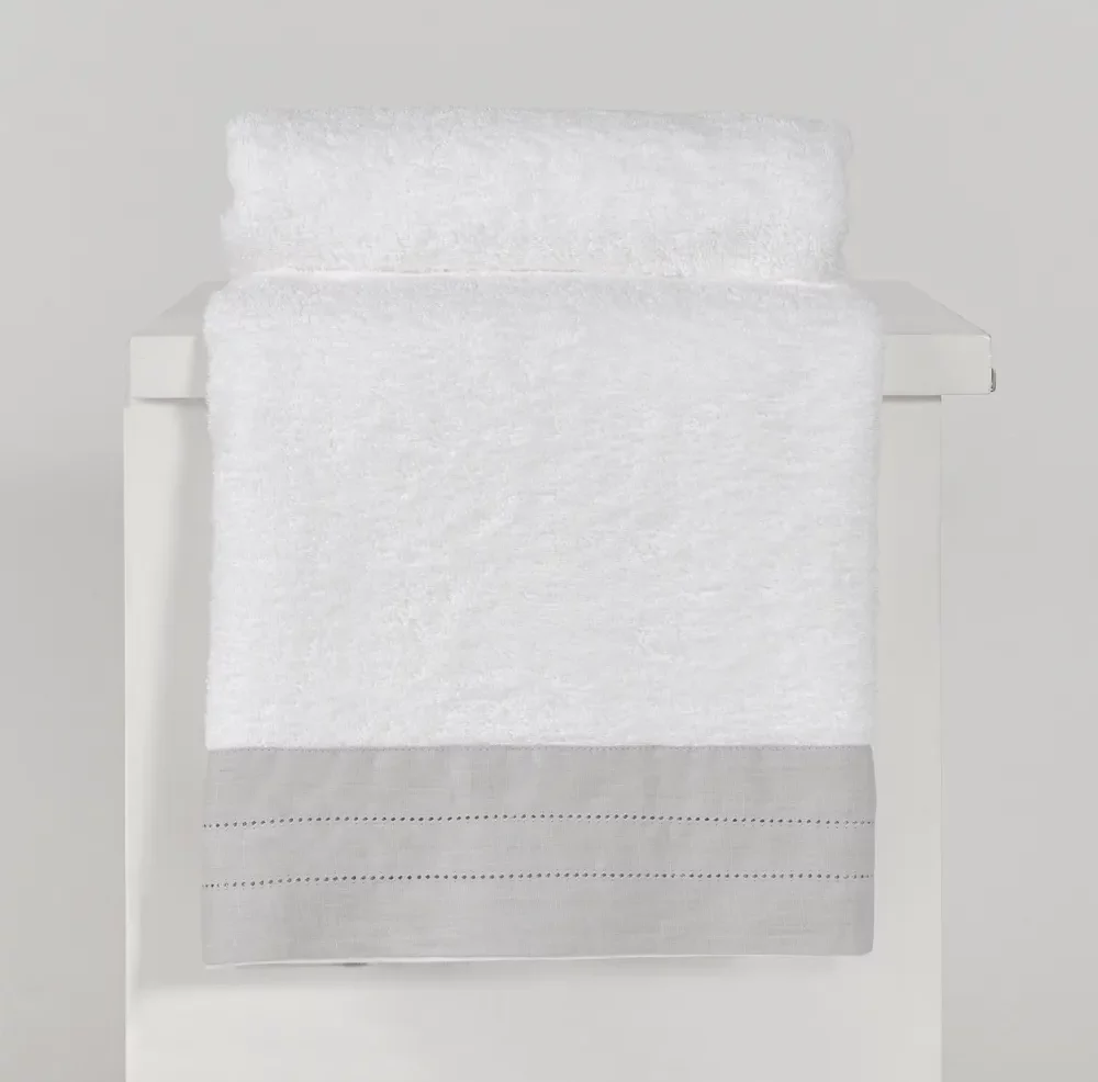 Toalla con aplicación de lino, un detalle que enmarca la toalla con su delicado punto ajour. La sencillez del diseño resalta la nobleza del tejido. Su tacto es ultrasuave gracias al algodón egipcio.