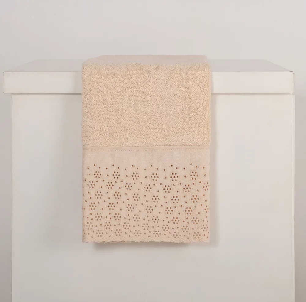 Las Toallas Lovely están fabricadas con hilo 100% algodón peinado, proporcionando alta capacidad de absorción, suavidad y tacto delicado. Presentan una guarda con un moderno bordado floral en puntos, que añade belleza y sofisticación. Cuentan con prelavado y preencogido.